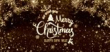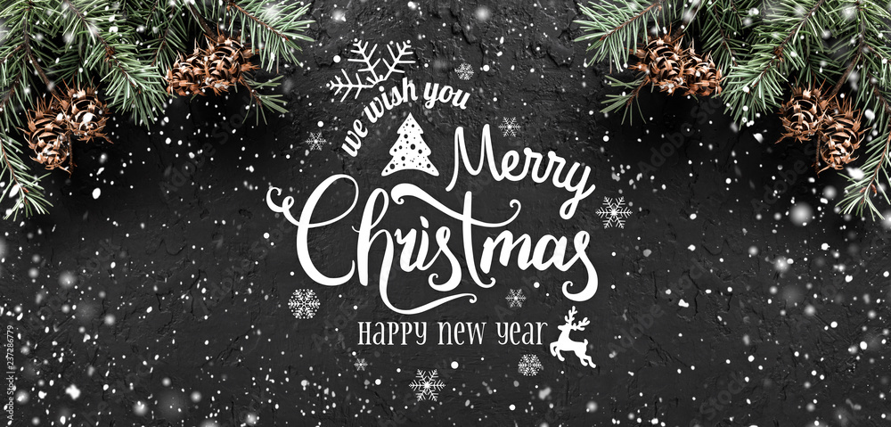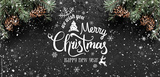 Christmas and New Year Typographical on dark holiday background with frame of Fir branches, pine cones, snowflakes. Xmas and Happy New Year theme, snow. Flat lay, top view