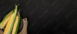 Fresh corn on cobs on a dark stone table. Food concept. Copy space top view. Wide composition