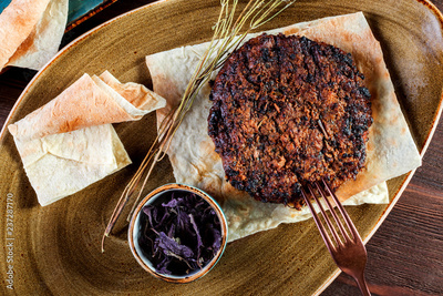 Grilled beef steak with spices served with glass of wine on a plate. Hot Meat Dishes. Top view