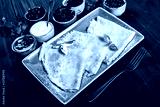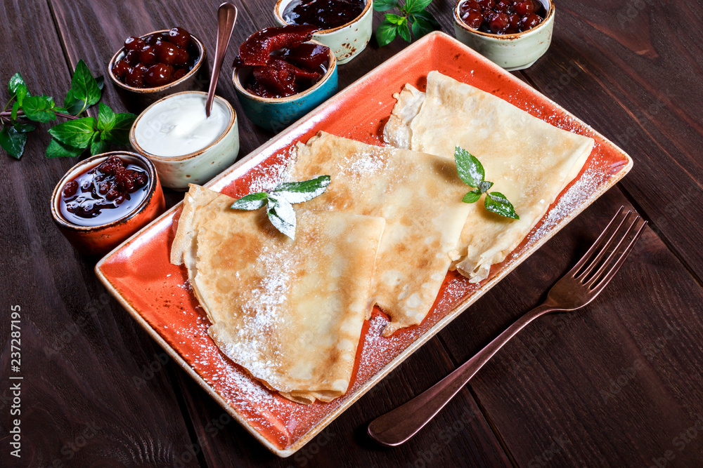 Pancakes with sour cream, powdered sugar, fruit jam, marmalade and berries on dark wooden background. Traditional Russian cuisine at the Pancake week or Shrovetide. Flat lay. Top view
