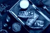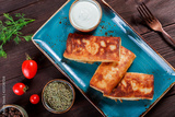 Pancakes with chopped meat and sour cream on dark wooden background close up. Traditional Russian cuisine at the Pancake week or Shrovetide. Flat lay. Top view