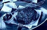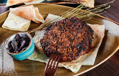 Grilled beef steak with spices served with glass of wine on a plate. Hot Meat Dishes. Top view