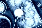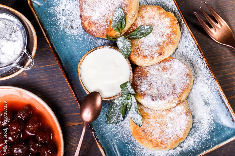Frying homemade cottage cheese pancakes syrniki with powdered sugar, sour cream, berries jam on plate close up. Traditional Russian cuisine at the Pancake week or Shrovetide. Flat lay. Top view