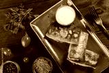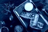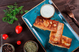 Pancakes with chopped meat and sour cream on dark wooden background close up. Traditional Russian cuisine at the Pancake week or Shrovetide. Flat lay. Top view
