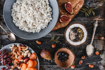 Rice coconut porridge with figs, berries, nuts, dried apricots and coconut milk in plate on rustic wooden background. Healthy breakfast ingredients. Clean eating, vegan food concept. Top view