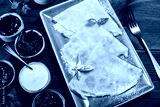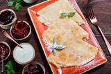 Pancakes with sour cream, powdered sugar, fruit jam, marmalade and berries on dark wooden background. Traditional Russian cuisine at the Pancake week or Shrovetide. Flat lay. Top view
