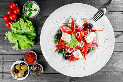 Greek salad of organic vegetables with tomatoes, cucumbers, red onion, olives, feta cheese and sweet pepper on wooden background. Healthy food. Top view