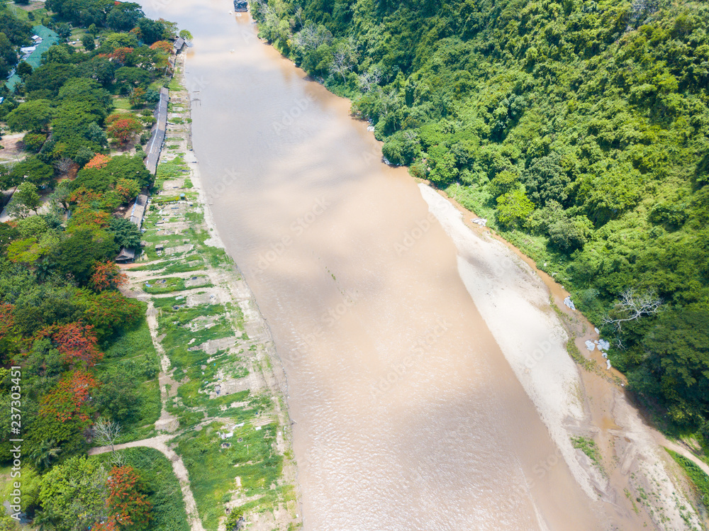 The beautiful landscape of the countryside of Chiang Rai province with Mae Kok river. High angle view from drone.