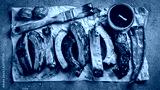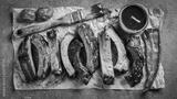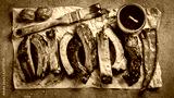 Closeup of pork ribs grilled with BBQ sauce and caramelized in honey. Tasty snack to beer on a paper for filing on dark concrete background. Top view. Flat lay
