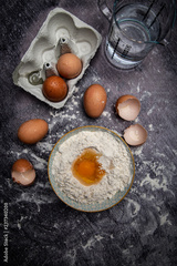 Tradycyjne wypieki. Kulinarne tło, jajka, mąka składniki potrzebne do ciasta.