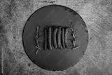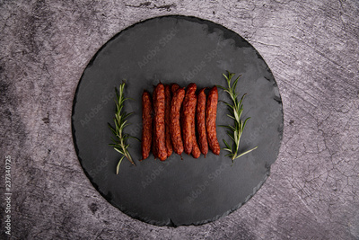 Kiełbaski i zioła na kamiennym tle. Kompozycja kiełbas na ciemnym tle z miejscem na twój tekst.