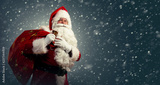 Santa Claus holding a bag with presents and ringing a bell on a dark background with snow