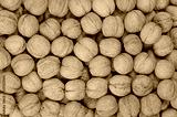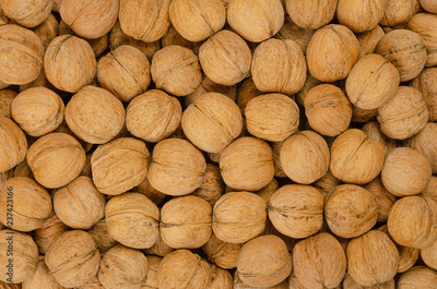 Walnuts background. Unshelled dried seeds of the common walnut tree Juglans regia. Pile of whole nuts with shells, used as snack, for baking and as decoration. Macro food photo close up from above.