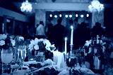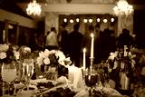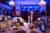 Wedding table settings in the restaurant. People dancing in the background of the Bridal table.