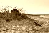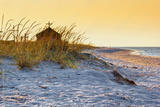 Seaside landscape - sunrise on the seashore with Orthodox Skete against the background of an summer sky