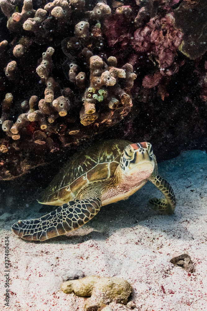 Green and hawksbill sea turtles swimming and resting in clear ocean. Coral reef and divers in the background
