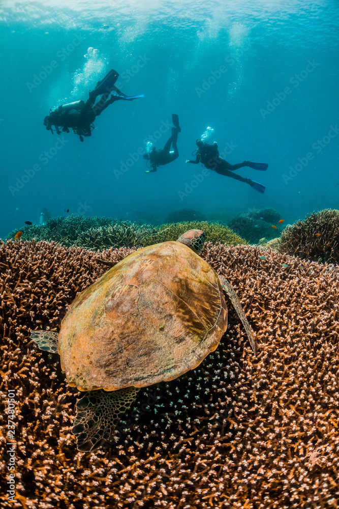 Green and hawksbill sea turtles swimming and resting in clear ocean. Coral reef and divers in the background