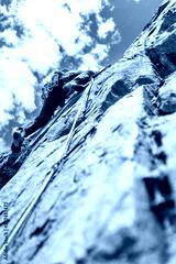 The last movements to reach the summit by a male climber. Rock climbing inside Andes mountains and valleys at Cajon del Maipo, an amazing place to enjoy rock climbing and mountaineering sports, Chile