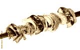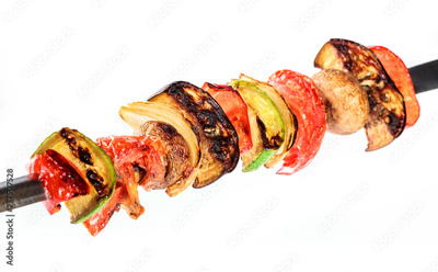 Grilled vegetable kebabs on skewers with cherry tomato, pepper, mushrooms, squash and onion on white background