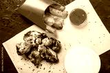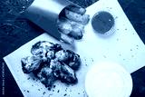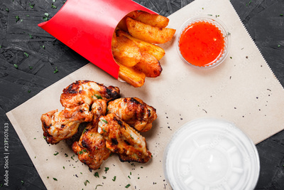 Fried chicken wings with baked potatoes and bbq sauce on craft paper on black background. Hot Meat Dishes. Top view