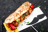 Sandwich from fresh pita bread with fillet grilled chicken and vegetables on dark wooden background. Shashlik or Shish kebab. Healthy lunch