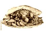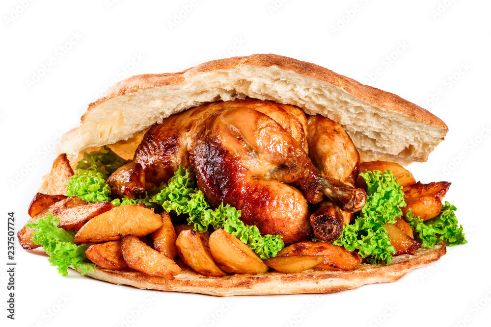 Roast chicken and potatoes in a big sandwich isolated on white background. Grilled meat