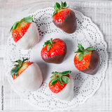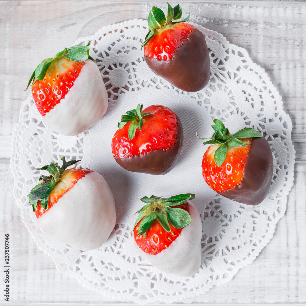 Fresh strawberries dipped in dark and white chocolate on light background close up. Delicious dessert and candy. Top view