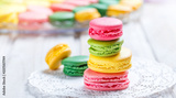 Colorful tasty macaroons on napkin, natural light selective focus. Sweet and colorful dessert close up