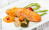 Baked salmon garnished with physalis, asparagus, tomatoes with herbs on wooden background. Hot fish dish. Top view
