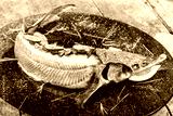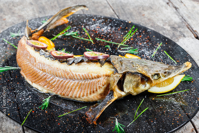Baked sturgeon fish with rosemary, lemon and passion fruit on plate on wooden background close up. Healthy food. Top view. Russian traditions. Top view