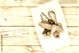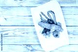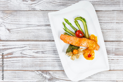 Baked salmon garnished with physalis, asparagus, tomatoes with herbs on wooden background. Hot fish dish. Top view