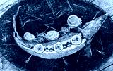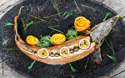 Baked sturgeon fish with rosemary, lemon and passion fruit on plate on wooden background close up. Healthy food. Top view. Russian traditions. Top view