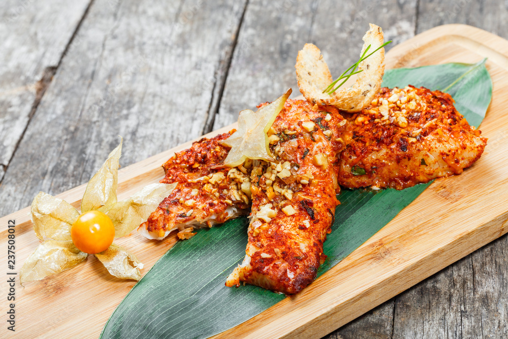 Fried sea fish fillets with physalis and almond on cutting board close up. Hot fish dish