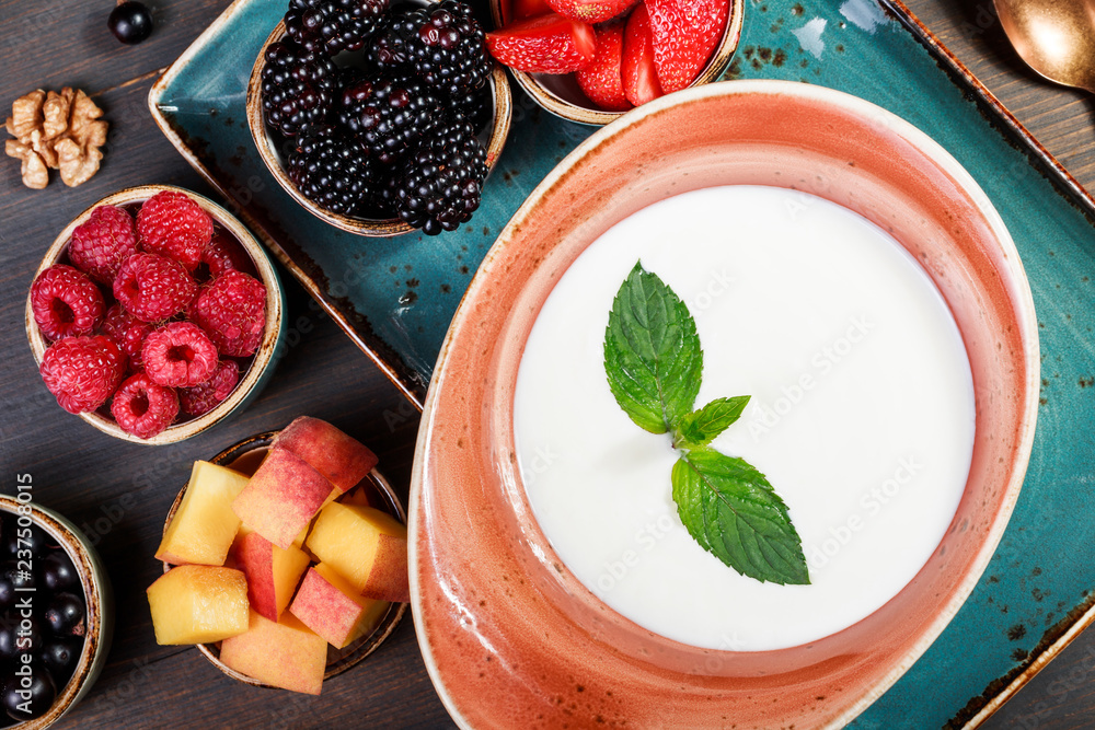 Yogurt with topping of currants, blackberries, strawberries, peaches, raspberries, nuts and honey on dark wooden background close up. Fresh yogurt. Healthy breakfast. Top view
