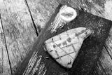 Baked salmon fillets with red caviar and lemon on stone slate background close up. Healthy food