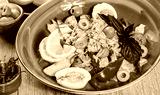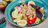 Fresh salad with tuna, olives, sweet peppers, eggs, fried potatoes, basil, lettuce and lemon on wooden background close up. Mediterranean food close up. Top view