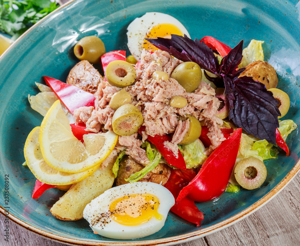 Fresh salad with tuna, olives, sweet peppers, eggs, fried potatoes, basil, lettuce and lemon on wooden background close up. Mediterranean food close up. Top view