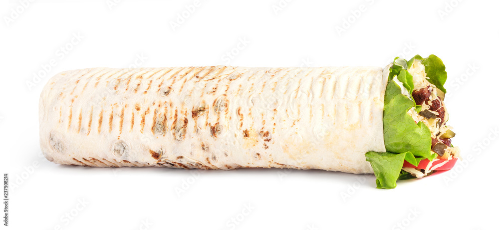 Burrito wraps from fillet grilled beef, lettuce, slices of fresh tomatoes, pickles and cheese on white background