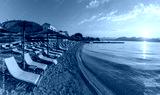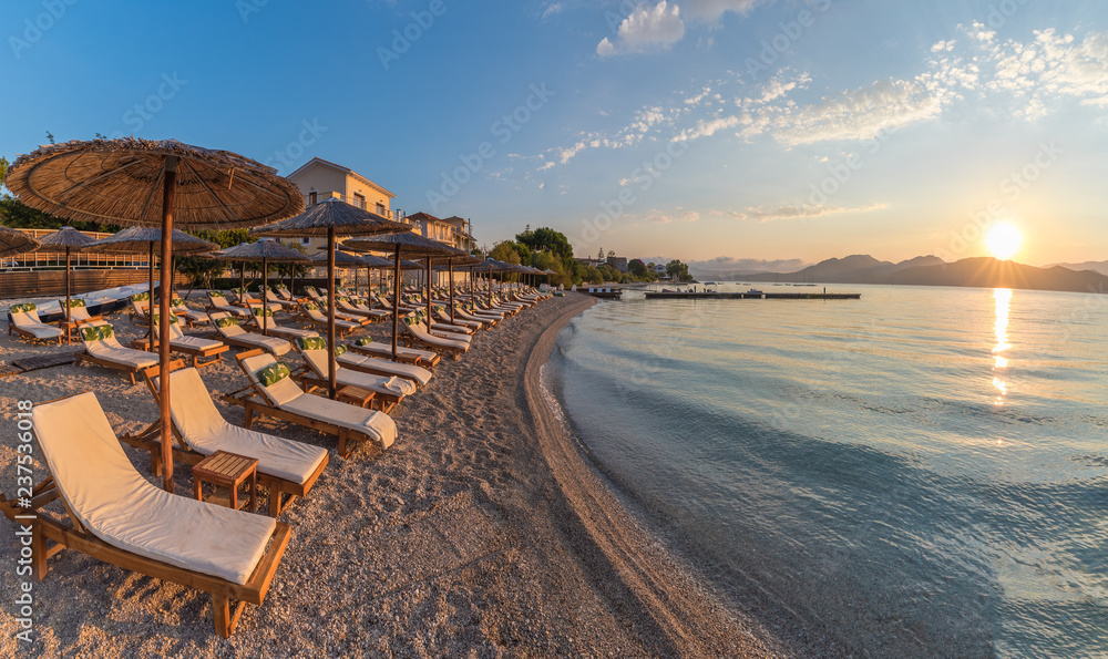 Sunbeds and umbrella on the beach at sunset time on Corfu Island, Greece