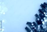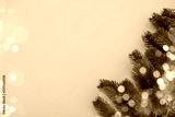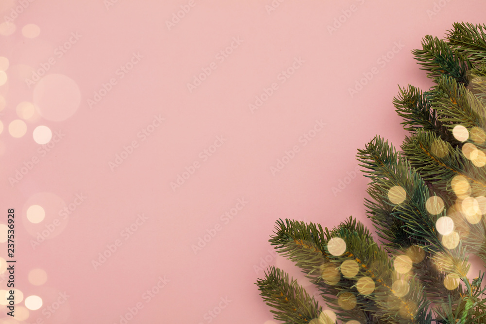 Festive fir tree branches and bokeh blurred fairy lights on a pink background
