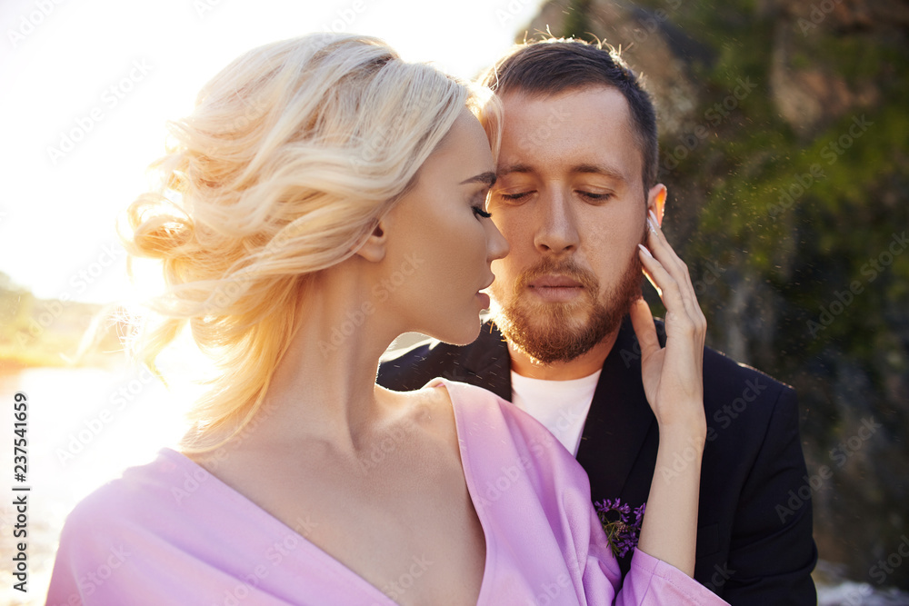 Couple in love stands in the splashes of water against the sunset. A man hugs a woman in a beautiful dress. Love in the eyes