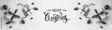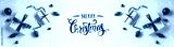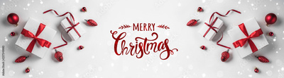 Merry Christmas Typographical on white background with gift boxes and red decoration. Xmas and New Year card, bokeh, light. Flat lay, top view, wide composition