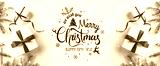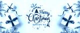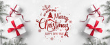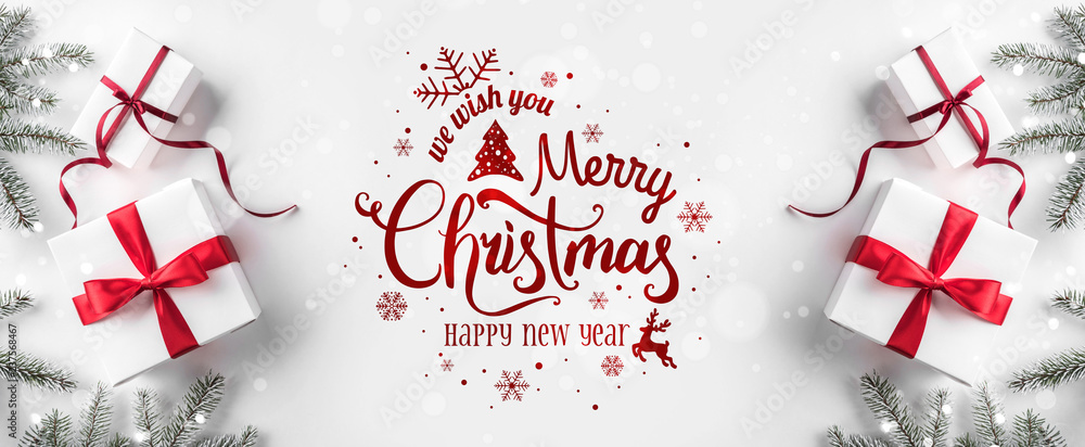 Merry Christmas Typographical on white background with gift boxes, fir branches, red decoration. Xmas and New Year card, bokeh, light. Flat lay, top view