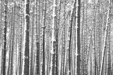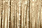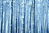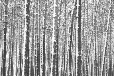 Black and white photo of winter pine forest in snowdrifts in cold and windy weather