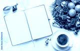 Christmas wreath, cup of coffee and Blank open notepad on white background.