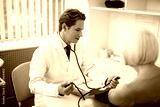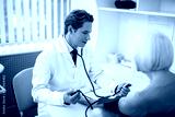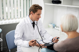 Calm experienced general practitioner sitting with his patient and looking at the gauge while measuring the blood pressure
