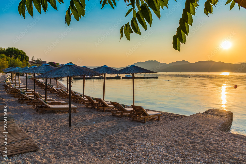 Nikiana beach with chairs and umbrellas at sunset time, Lefkada island, Greece