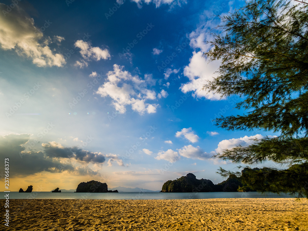 Sunset across the ocean with orange sky and island silhouettes on the horizon, large tree in the foreground