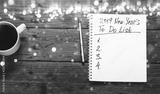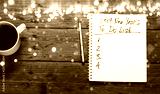 New year 2019 Goals Concept. Notepad with To do list and cup of coffee on wooden table, top view, flat lay