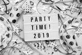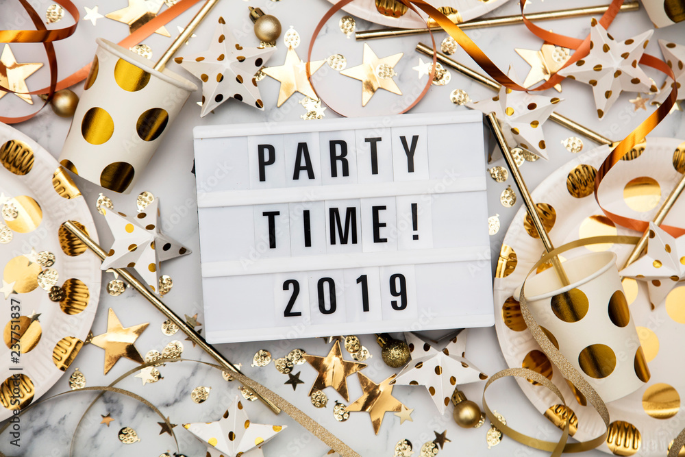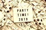 Party time 2019 lightbox celebration message with luxury gold party decorations